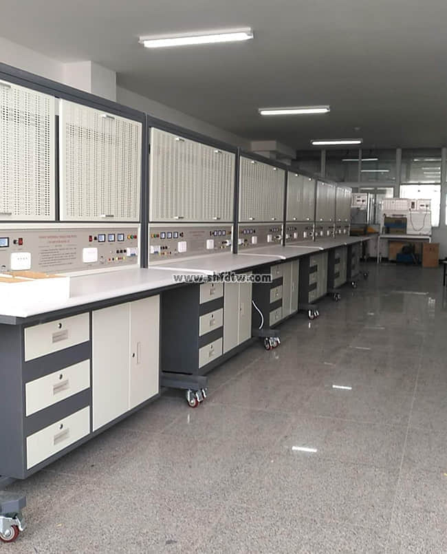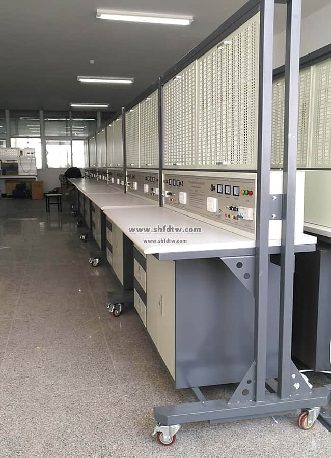 4、實(shí)訓(xùn)桌桌面采用25mm麻灰色高密度層壓板封邊特制,有效提高絕緣等級(jí);實(shí)驗(yàn)桌底部裝有至少4個(gè)導(dǎo)向輪,方便實(shí)訓(xùn)臺(tái)架移動(dòng);