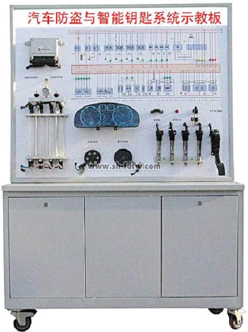汽車主駕駛車門總成、中央控制防盜系統(tǒng)、一鍵啟動(dòng)系統(tǒng)、起動(dòng)機(jī)、點(diǎn)火開關(guān)、ECU及診斷座、各傳感器、彩色原理面板圖、便攜式網(wǎng)孔安裝板為基礎(chǔ)的可移動(dòng)式臺(tái)架、使用說(shuō)明書等。