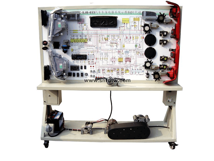 6. 實訓(xùn)臺除車身外配移動教板,教板完整顯示車身低壓系統(tǒng)工作原理圖,并安裝用檢測端子,借助萬用表和示波儀,實時檢測各種狀態(tài)下參數(shù)變化。