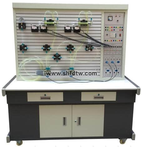 實(shí)驗(yàn)臺(tái)由實(shí)驗(yàn)臺(tái)架、工作泵站、氣動(dòng)元件、電氣控制單元等幾部分組成。