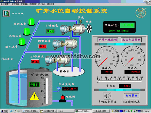 具有完善的報警系統(tǒng),能逼真的模擬工業(yè)現(xiàn)場的各種情況,如礦井液位、泵轉(zhuǎn)速及電機溫度的檢測信號故障報警,低水位、高水位以及超高水位的聲光同步報警、優(yōu)先級報警,報警復(fù)位和報警禁止復(fù)位等功能