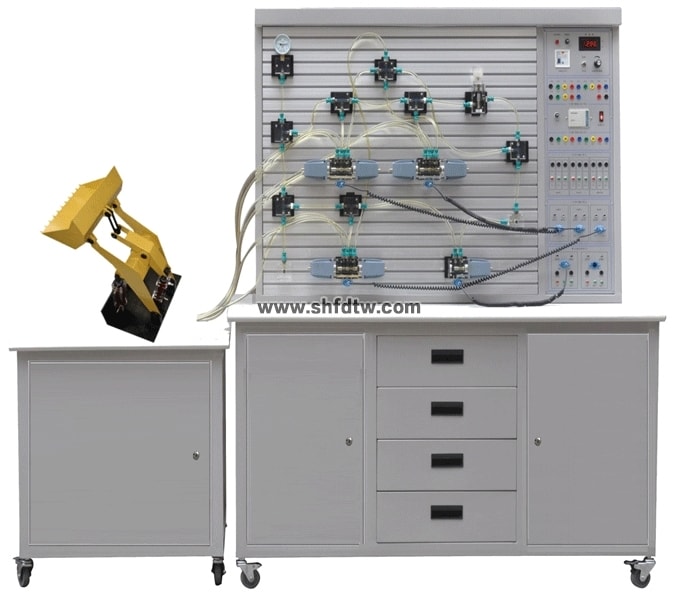 1、在原有透明液壓PLC控制實訓裝置幾十種基本回路上增加了可模擬真實裝載機工作裝置各種動作。透明液壓PLC控制實訓裝置(裝載機液壓實訓臺)主要由實訓桌、控制實訓臺、裝載機實訓臺、液壓元件和電器控制器件、可編程控制器(PLC)等組件組成。