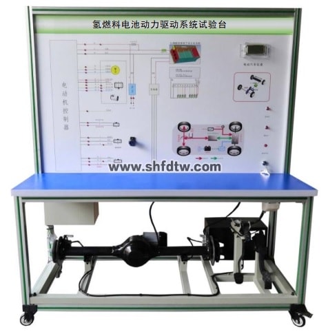 檢測控制面板(裝有各種檢測端子以及彩色電路圖)、氫燃料電池及控器、電機(jī)與驅(qū)動橋總成、電機(jī)控制器、點(diǎn)火開關(guān)、電子油門、檔位裝置、電池組與鐵電池箱、充電機(jī)、DC12V裝置、一體化全鋁合金型材搭建的移動臺架(1500×700×1700mm 帶自鎖腳輪裝置,帶安裝檢測端子的原理面板,面板1448×940mm)、設(shè)備操作說明書。