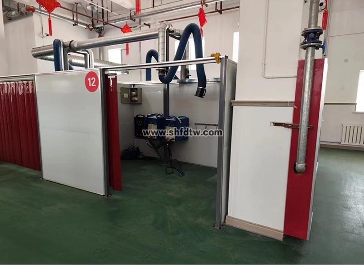 2、工位隔斷絕緣防火,主體材料達到國家防火等級A1級別,隔斷框架方管固定。工位門須裝有滑道開合紅色遮弧簾,以防學(xué)員實訓(xùn)或考核比賽時弧光傷害巡視老師、裁判或觀摩人員眼睛。