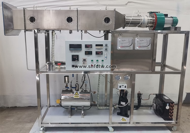 制冷壓縮機(jī)、風(fēng)冷冷凝器、風(fēng)機(jī)盤管蒸發(fā)器、實(shí)驗(yàn)風(fēng)洞、蒸氣加濕器、電加熱器、保障蒸發(fā)器被壓的引風(fēng)機(jī)、進(jìn)、出風(fēng)洞的空氣參數(shù)測(cè)試系統(tǒng)、控制調(diào)節(jié)系統(tǒng)等組成。