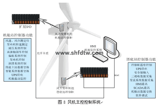 主控系統(tǒng)用于連接風(fēng)速風(fēng)向傳感器、震動傳感器、位置傳感器、測量、安全鏈、監(jiān)控系統(tǒng)等,控制風(fēng)速方向、偏航、變槳等信息。