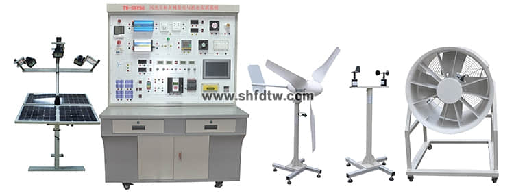 系統(tǒng)裝置由太陽能光伏電板、雙軸跟蹤控制模塊、蓄電池模塊、太陽能控制器模塊、太陽能逆變器模塊、模擬風(fēng)洞發(fā)電模塊、開關(guān)控制模塊、環(huán)境監(jiān)測模塊、上位機(jī)監(jiān)控模塊,儀表顯示部分,(各功能轉(zhuǎn)換接口模塊)等組成;各控制系統(tǒng)集成于風(fēng)能發(fā)電、光伏發(fā)電為一體的教學(xué)實訓(xùn)臺;各系統(tǒng)通過連接電纜進(jìn)行連接,形成一套可完成風(fēng)力及光伏發(fā)電、同步并網(wǎng)、離網(wǎng)電源的實驗及教學(xué)演示。幫助學(xué)生理解太陽能并網(wǎng)、離網(wǎng)及風(fēng)力發(fā)電系統(tǒng)的原理,從而起到學(xué)習(xí)工程實際應(yīng)用技能的作用。