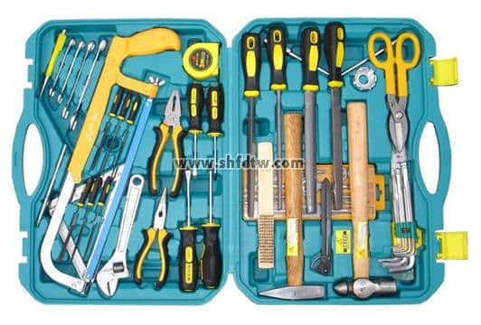 (9)裝調(diào)工具:有套裝工具(55件)、臺虎鉗、劃線平板、拉馬、圓螺母扳手、卡簧鉗、紫銅棒、截鏈器等。套裝工具由工具箱、內(nèi)六角扳手、呆扳手、活動扳手、銼刀、絲錐、鉸杠、劃規(guī)、樣沖、錘子、板牙、板牙架、螺絲刀、鋸弓、尖嘴鉗、老虎鉗等組成。