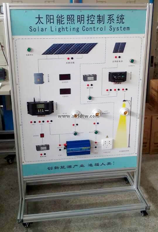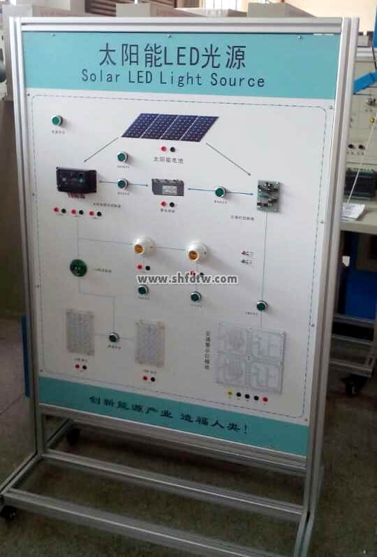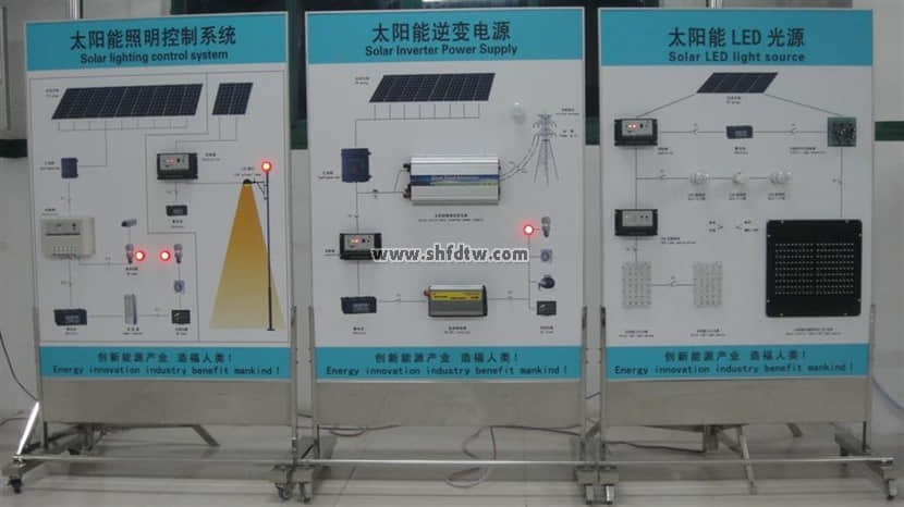 光伏發(fā)電系統(tǒng)集成演示版,主要由A、B、C三塊主模板組成。A 太陽能照明控制系統(tǒng)演示模板、B 太陽能離&并網(wǎng)逆變系統(tǒng)演示模板、C 太陽能LED光源系統(tǒng)演示模板。