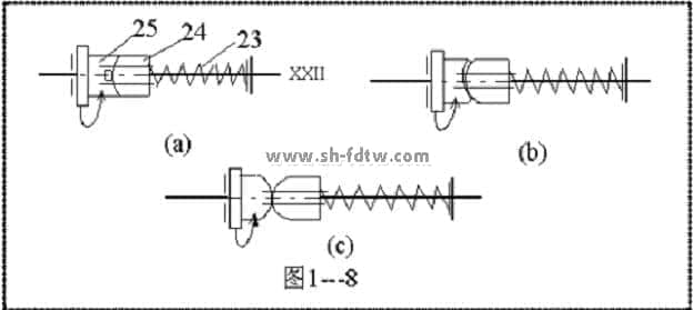 進(jìn)給過程中,當(dāng)進(jìn)給力過大或刀架移動(dòng)受到阻礙時(shí),為了避免損壞傳動(dòng)機(jī)構(gòu),在溜板箱中設(shè)置有進(jìn)給的過載保險(xiǎn)裝置,以便使刀架在過載時(shí)自動(dòng)停止進(jìn)給。6140型車床溜板箱中的這種過載保險(xiǎn)裝置,又稱為安全離合器,它的結(jié)構(gòu)如圖1---8。由光桿傳來(lái)的運(yùn)動(dòng)經(jīng)齒輪(Z56)及超越離合器傳至安全離合器的左半部25,然后再通過螺旋形端面齒傳至離合器的右半部24,離合器右半部24的運(yùn)動(dòng)經(jīng)花鍵傳至軸XXII。在離合器右半部24的后端裝有彈簧23,的壓力,使離合器的右半部24與左半部25相嚙合,克服離合器在傳遞扭矩過程中所產(chǎn)生的軸向分力。在正常機(jī)動(dòng)進(jìn)給情況下,運(yùn)動(dòng)由超越離合器經(jīng)安全離合器傳至軸XXII(圖a)。當(dāng)出現(xiàn)過載時(shí),蝸桿軸的扭矩增大并超過允許值,這時(shí)通過安全離合器端面螺旋齒傳遞的扭矩也隨之增加,以致使端面螺旋齒處的軸向推力超過了彈簧23的壓力,于是便將離合器右半部24推開(圖b),這時(shí)離合器左半部25繼續(xù)旋轉(zhuǎn),而右半部24卻不能被帶動(dòng),所以在兩者之間產(chǎn)生打滑現(xiàn)象(圖c),將傳動(dòng)鏈斷開,因此使傳動(dòng)機(jī)構(gòu)不致因過載而損壞。當(dāng)過載現(xiàn)象消失后,由于彈簧23的彈力,安全離合器自動(dòng)地恢復(fù)到原來(lái)的正常狀態(tài)。機(jī)床許用的進(jìn)給力決定于彈簧的彈力。擰動(dòng)螺母,調(diào)整桿及止推套的軸向位置,就可調(diào)整彈簧的彈力。