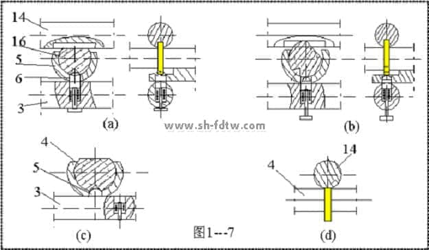 為了避免損壞機(jī)床,在接通機(jī)動(dòng)進(jìn)給或快速移動(dòng)時(shí),對(duì)開合螺母不應(yīng)合上。反之,合上對(duì)開螺母時(shí),就不許接通機(jī)動(dòng)進(jìn)給和快速移動(dòng)。圖1---7是互鎖機(jī)構(gòu)的工作原理圖。圖a是中間位置時(shí)情況,這時(shí)機(jī)動(dòng)進(jìn)給(或快速移動(dòng))末接通,對(duì)開螺母也處于脫開狀態(tài),所以這時(shí)可任意地接合對(duì)開螺母操縱手柄,或進(jìn)給操縱 手柄。圖b是合上對(duì)開螺母時(shí)的情況,這時(shí)由于手柄軸4轉(zhuǎn)過了一個(gè)角度,它的凸肩旋入到軸14的槽中,將軸14卡住,使它不能轉(zhuǎn)動(dòng),同時(shí)凸肩又將銷子5壓入到軸3的孔中,由于銷子5的另一半尚留在固定套16中,所以就將軸3卡住,使它不能軸向移動(dòng) 。由此可見,如合上對(duì)開螺母,進(jìn)給及快移的操縱手柄1就被鎖住,不能扳動(dòng),因此就能避免同時(shí)接通機(jī)動(dòng)進(jìn)給或快速移動(dòng)。圖1---7c是向左扳動(dòng)進(jìn)給及快移操縱手柄1時(shí)的情況(接通向左的縱向進(jìn)給或快速移動(dòng)),這時(shí)軸3向右移動(dòng),軸3上的圓孔也隨之移開,銷5被軸3的表面頂住不能往下移動(dòng),于是它的上端就卡在手柄軸4的v形槽中,將手柄軸4鎖住,使對(duì)開螺母操縱手柄軸4不能轉(zhuǎn)動(dòng),也就是使對(duì)開螺母不能閉合。圖1---7d是進(jìn)給及快移操縱手柄向前扳動(dòng)時(shí)的情況(接通向前的橫向進(jìn)給或快速移動(dòng))。這時(shí),由于軸14轉(zhuǎn)動(dòng),軸14上的長(zhǎng)槽也隨之轉(zhuǎn)開,于是手柄軸4上的凸肩被軸14頂住,使軸4不能轉(zhuǎn)動(dòng),所以,這時(shí)對(duì)開螺母也不能閉合。