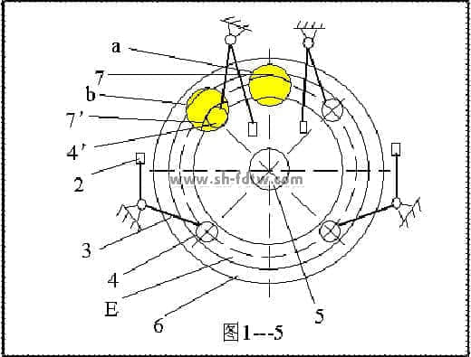基本組的4個(gè)滑動(dòng)齒輪是由一個(gè)手把集中操縱的。圖1---5是操縱機(jī)構(gòu)簡(jiǎn)圖,基本組的4個(gè)滑動(dòng)齒輪分別由4個(gè)撥塊2來(lái)?yè)軇?dòng),每個(gè)撥塊的位置是由各自的銷子4分別通過杠桿3來(lái)控制的,四個(gè)銷子4均勻地分布在操縱手輪6背面的環(huán)形槽E中,環(huán)形槽中有兩個(gè)間隔450的孔a和b,孔中分別安裝有帶斜面的壓塊7和7’,其中壓塊7的斜面向外斜,壓塊7’的斜面向里斜。操縱手輪時(shí),先將手輪6向外拉,手輪6轉(zhuǎn)到所需位置后,將手輪重新推入就可以進(jìn)行變速。