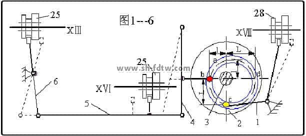 圖1---6是操縱機(jī)構(gòu)簡(jiǎn)圖,其中杠桿4、5、6是操縱移換機(jī)構(gòu)的,圖中是接通公制傳動(dòng)路線時(shí)的情況。杠桿1是操縱軸XⅧ右端滑動(dòng)齒輪Z38的,圖中是接通進(jìn)給時(shí)的情況。杠桿1和4的滾子都裝在凸輪2的偏心圓槽中。此偏心圓槽的a點(diǎn)和b點(diǎn)離開回轉(zhuǎn)中心的距離為l,而c點(diǎn)和d點(diǎn)離開回轉(zhuǎn)中心的距離則為L(zhǎng)。凸輪2固定在操縱手柄的軸3上。因此,如扳動(dòng)手柄至4個(gè)不同的圓周位置,就可分別按公制或英制傳動(dòng)絲桿或光桿。