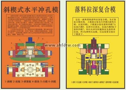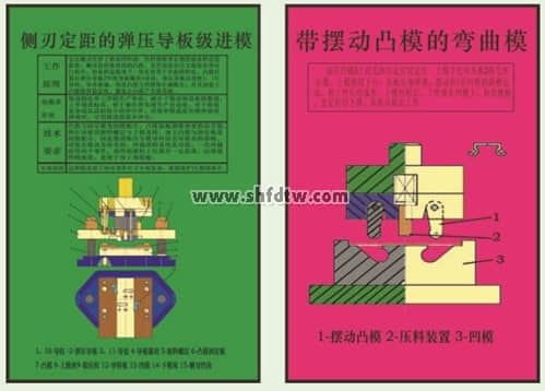 5、實(shí)驗(yàn)裝置采用32件沖壓模具模型和32塊文字圖表板,分別介紹各種塑料模具的功能和結(jié)構(gòu)及用途與作用。