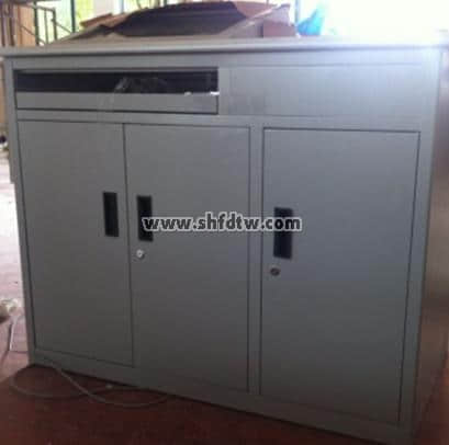 3、臺面用環(huán)保型防火板貼面,25㎜厚成型臺面(基材為熱性樹脂浸漬紙高壓裝飾層積板,顏色為亞灰白)。顯示窗口玻璃為5㎜的鋼化玻璃.