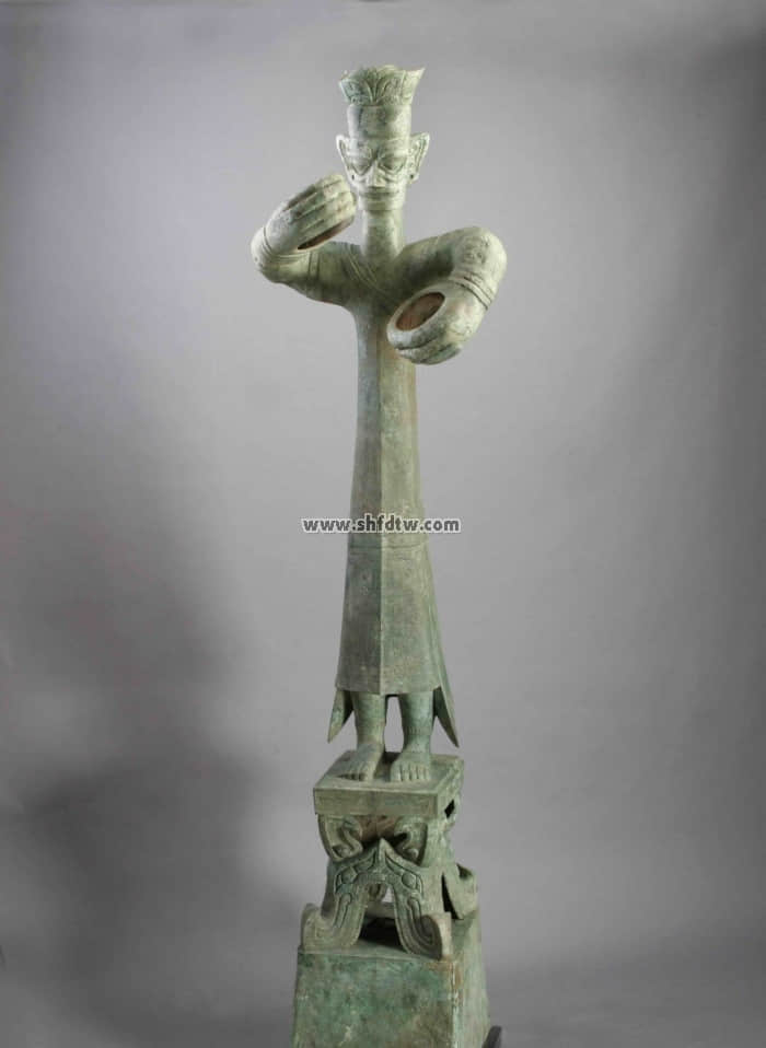 青銅立人像在三星堆出土,三星堆祭祀坑出土了數(shù)量巨大、種類繁多,詭秘怪異的各類文物,足以證明殷商中晚期至西周早期的古蜀國,正處于各種原始宗教觀念雜存并茂的時代,近十幾年來,史學(xué)家們通過對三星堆出土文物的研究,已揭示出三千多年前古蜀先民存在著對祖先英雄——蠶叢、魚鳧、杜宇的崇拜,也同時存在著對圖騰自然物——蠶、魚、鳧、竹、太陽、雞、樹、山的崇拜。在2004年第4期的 《四川文物》 上有學(xué)者著文分析了三星堆存在的“眼崇拜”,令人深感三星堆還有許多待解之謎。