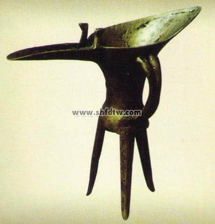 銅爵是飲酒的器具,相當于現(xiàn)在的酒杯。該銅爵依據河南偃師二里頭出土的文物資料而仿制。中國的青銅器最早出現(xiàn)于公無前三千年的馬家窯文化。夏代能制造復雜的青銅器物,到商代制造工藝更加嫻熟,造型更加精湛。