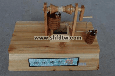 轆轤是我國(guó)古代利用人力灌溉的工具。據(jù)《物原》記載,周朝初年的史官史佚作轆轤,湖北大冶銅緣山發(fā)現(xiàn)的春秋末朝到戰(zhàn)國(guó)初期的古礦井遺址表明,當(dāng)時(shí)已使用了轆轤提水工具。這種可用手柄搖轉(zhuǎn)的軸,軸的轉(zhuǎn)動(dòng)能使繞著繩子一端的水桶輕松的吊上或放下,說(shuō)明它比桔槔的功能更先進(jìn)。本模型根據(jù)漢代代石刻《轆轤井畫像》仿制而成。