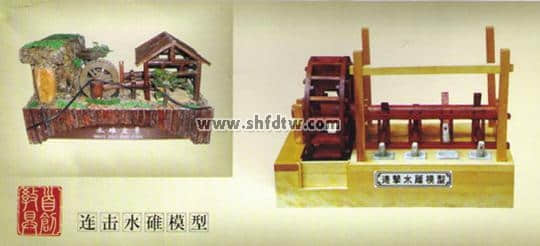 連擊水碓是西方漢(前206-公元前8年)時代出現(xiàn)的糧食加工工具,它以水為動力帶動四組碓頭同時工作,主要為谷類去皮。水碓利用水力舂米功效比手舂高百倍,比腳舂高十倍。不但提高功效,而且還提高了米質。本模型按中國古代科技文物資料仿制。