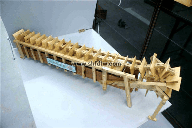 翻水車又名龍骨水車,是一種農(nóng)田灌溉工具。東漢靈帝(166-189年)時畢嵐發(fā)明翻水車,三國時的馬鈞予以完善、推廣。它由手柄 、曲軸、齒輪鏈板等到部件組成,先以人的手動或腳動為動力,后擴(kuò)展利用畜力、水力和風(fēng)力,一直使用到現(xiàn)在。本模型據(jù)《魏略》及傳統(tǒng)水車仿制