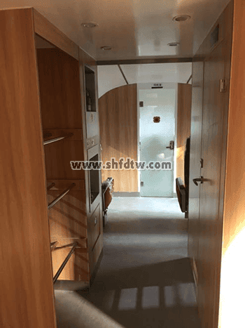 4)一等旅客區(qū)右后方配備大型行李儲藏架和模擬飲水機;滅火器對面衛(wèi)生間區(qū)域