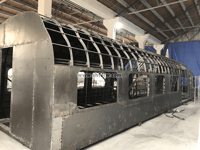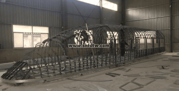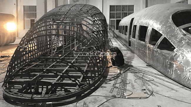 骨架為 5mm 厚鋼板高精度切割弧形焊接,在焊接、銼修處涂鐵紅防銹底漆,蒙1.5mm 厚鋼板,車身兩側(cè)切割窗口鑲嵌高級 PC 耐力透明板。