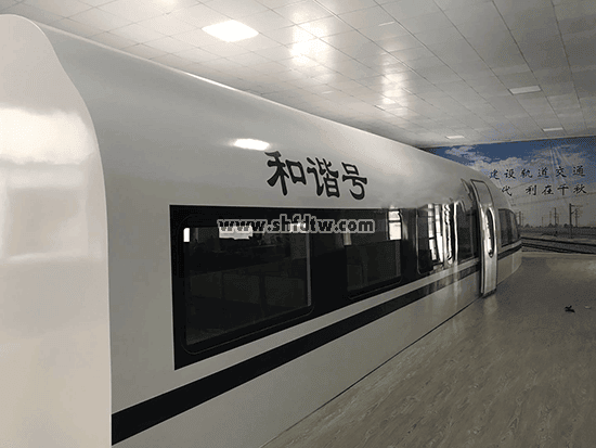 ?側(cè)窗采用鑲嵌高級PC耐力透明板,由透明板和艙體結(jié)構(gòu)框粘接而成,位置尺寸均模擬和諧號CRH380B動車的布局;