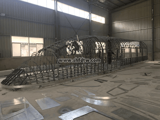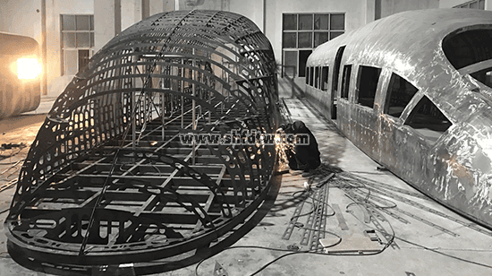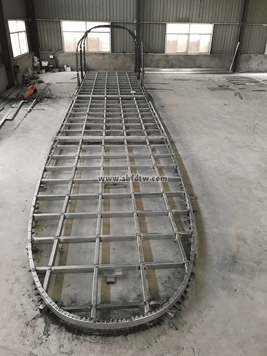 骨架為5mm厚鋼板高精度切割弧形焊接,在焊接、銼修處噴涂環(huán)氧底漆,蒙2mm厚鋼板,車身兩側(cè)切割窗口鑲嵌高級PC耐力透明板。