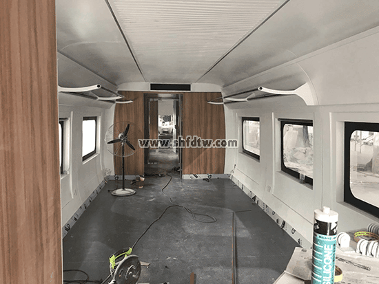 在底板表面進行18毫米多層板鋪墊后在做列車地膠表面鋪墊工作 |