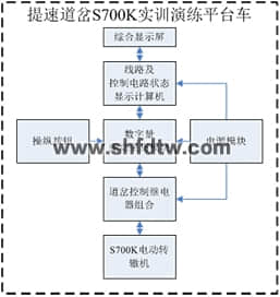 提速道岔S700K實(shí)訓(xùn)演練平臺通過道岔操縱按鈕接通道岔控制電路,控制S700K轉(zhuǎn)轍機(jī)的定、反位的動作。在接通道岔啟動電路時、轉(zhuǎn)轍機(jī)轉(zhuǎn)換到相應(yīng)的位置并給出定/反位表示表示后,在綜合顯示屏上顯示繼電器線圈和接點(diǎn)狀態(tài),并連通相應(yīng)的表示電路,點(diǎn)亮對應(yīng)的表示燈。當(dāng)轉(zhuǎn)轍機(jī)不到位或故障時,給出相應(yīng)提示。此練功平臺能使學(xué)員在較小的室內(nèi)空間內(nèi)達(dá)到身臨其境的感覺。同時通過道岔控制電路的實(shí)時顯示,直觀的反映電路的動作情況,從而達(dá)到常規(guī)現(xiàn)場教學(xué)無法達(dá)到的效果。平臺各部件間接口如下圖所示: