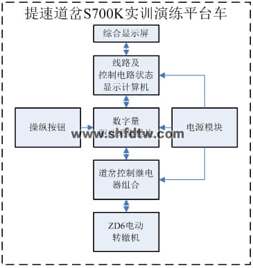 ZD6轉(zhuǎn)轍機(jī)實(shí)訓(xùn)演練平臺通過道岔操縱按鈕接通道岔控制電路,控制ZD6轉(zhuǎn)轍機(jī)的定、反位的動作。在接通道岔啟動電路時、轉(zhuǎn)轍機(jī)轉(zhuǎn)換到相應(yīng)的位置并給出定/反位表示表示后,在綜合顯示屏上顯示繼電器線圈和接點(diǎn)狀態(tài),并連通相應(yīng)的表示電路,點(diǎn)亮對應(yīng)的表示燈。當(dāng)轉(zhuǎn)轍機(jī)不到位或故障時,給出相應(yīng)提示。此練功平臺能使學(xué)員在較小的室內(nèi)空間內(nèi)達(dá)到身臨其境的感覺。同時通過道岔控制電路的實(shí)時顯示,直觀的反映電路的動作情況,從而達(dá)到常規(guī)現(xiàn)場教學(xué)無法達(dá)到的效果。平臺各部件間接口如下圖所示:
