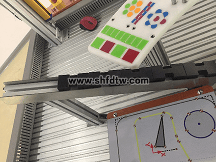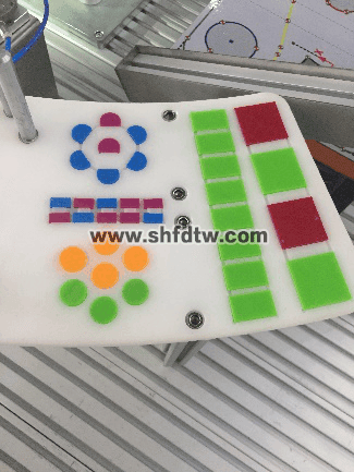 1) 安裝檢測單元內(nèi)含4個功能相同的裝配檢測工位,可與工業(yè)機(jī)器人配合完成PCB異形芯片的安裝及檢測功能,4個工位的安裝由鋁型材搭建的框架支撐 2) 安裝檢測工位整體尺寸為410mm×190mm×180mm,結(jié)構(gòu)為鋁合金材質(zhì),分為底板、安裝平臺和檢測支架 3) 安裝平臺安裝在雙列線性滑軌上,寬度9mm,長度300mm,采用氣動驅(qū)動,內(nèi)徑16mm,有效行程200mm,安全保持力140N 4) 檢測支架升降由氣動驅(qū)動,內(nèi)徑16mm,有效行程20mm,安裝有LED導(dǎo)光板,尺寸為100mm×100mm×1.5mm,顏色藍(lán)色,可在檢測過程中亮起 5) 底板安裝有紅、綠兩色指示燈,用于在檢測完成后提示安裝是否有誤、芯片是否有缺陷 |