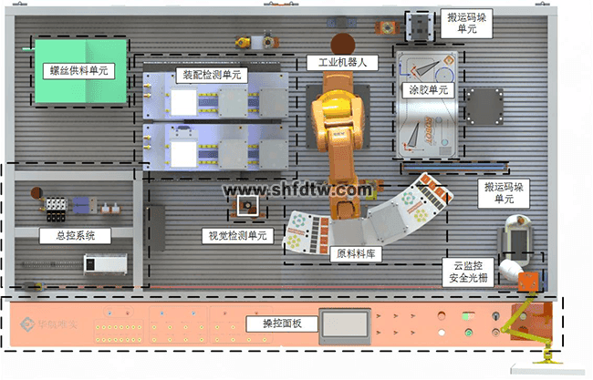 工業(yè)機(jī)器人PCB異形插件工作站以3C典型產(chǎn)品的生產(chǎn)裝配過程為主線,包含了涂膠、搬運(yùn)碼垛、視覺分揀、裝配、鎖螺絲、檢測等工藝過程,所有涉及設(shè)備均合理布置在工作站臺面上,方便查看設(shè)備狀態(tài)和操作編程,布局方式如圖 3所示。