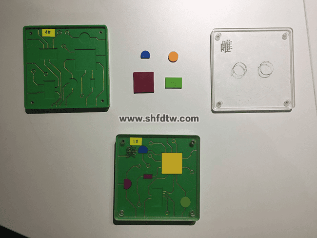 1) ▲電子產(chǎn)品PCB電路板由異形芯片零件、PCB電路板和蓋板組成,PCB電路板和蓋板由螺絲緊固 2) 異形芯片零件,包括圓形、小矩形、大矩形、方形等不同形狀和不同顏色的芯片,用以代表CPU、集成電路、電阻、電容、三極管等元件 3) PCB電路板,尺寸120mm×120mm,厚12mm,上繪制了模擬電路線路圖,留有不同異形芯片零件的安裝位置,每個PCB電路板的線路圖和芯片零件安裝位置都不相同,代表不同電子產(chǎn)品,四角提供螺釘孔 4) 蓋板,尺寸120mm×120mm,厚5mm,外殼雕刻文字代表不同電子產(chǎn)品,四角提供螺釘孔 |