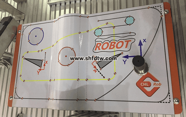 1) 3D軌跡圖板尺寸440mm×250mm,具有半經(jīng)50mm的拱形面,材質(zhì)碳鋼烤漆,厚度3mm 2) 軌跡路徑包含圓形、三角形、復(fù)雜輪廓和樣條曲線,以及不同位置、不同指向的基準(zhǔn)坐標(biāo)系 3) 提供工具TCP參數(shù)標(biāo)定用尖錐,材質(zhì)不銹鋼,可以隨意固定在3D軌跡圖板的任何位置 4) 包含2張軌跡圖紙,可自動吸附在3D軌跡圖板上 |