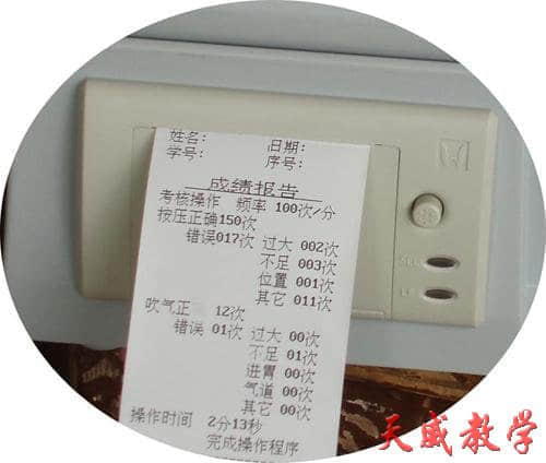 1、訓(xùn)練練習(xí):此項(xiàng)操作是讓初學(xué)人員熟練掌握操作基本要領(lǐng)及各項(xiàng)步驟。學(xué)員做好操作前的各項(xiàng)功能設(shè)定,順計(jì)時(shí)開始后,首先進(jìn)行氣道放開,然后進(jìn)行先口對口吹氣或先胸外按壓都可以,操作正確錯(cuò)誤有各類功能數(shù)碼顯示及語言提示。當(dāng)在設(shè)定的時(shí)間內(nèi)順計(jì)時(shí)到250秒后停機(jī),可按打印鍵,即打印出訓(xùn)練練習(xí)成績報(bào)告單(日期、姓名、學(xué)號、序號、所需時(shí)間、吹氣的正確、錯(cuò)誤次數(shù)與按壓正確、錯(cuò)誤次數(shù)等功能打印)。以備考試成績評定及存檔。