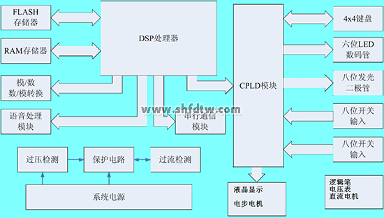 1、中心處理模塊。主要包括DSP微處理器TMS320VC5402,RAM(CY7C1021),F(xiàn)ALSH(SST39LF200A),是整個實驗驗裝的核心部分,負(fù)責(zé)整個實驗系統(tǒng)各模塊間的控制。