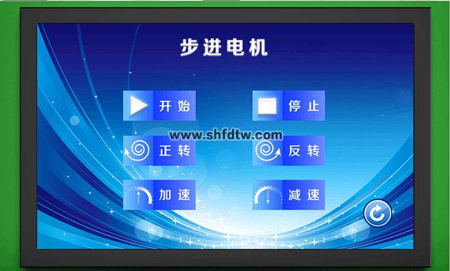 ④ 加載STEP-motor例程并運(yùn)行程序,然后點(diǎn)擊步進(jìn)電機(jī)控制按鈕,預(yù)設(shè)了開(kāi)始、停止、正轉(zhuǎn)、反轉(zhuǎn)、加速及減速功能。