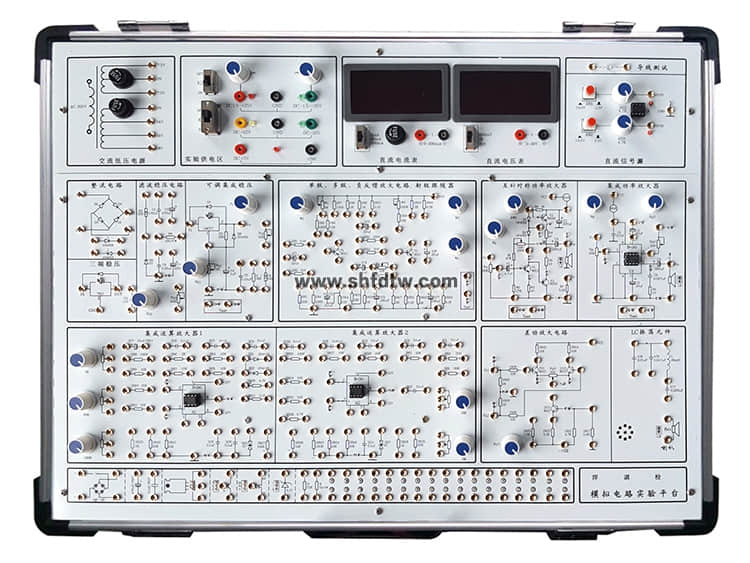 實驗箱由鋁木合金箱體、高性能線性電源、和實驗電路板組成。其中實驗電路采用固定功能模塊方式,電路原理和元器件符號清晰,實驗用元器件可以焊裝在線路板的反面,安全可靠,不易損壞,也可以裝在線路板的正面,元件直觀可見,感性認識強,正面還有實驗電路原理圖,使學(xué)生在實驗時對原理一目了然。