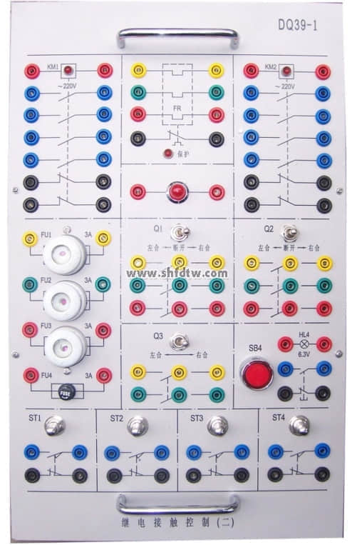 提供交流接觸器(線圈電壓220V)三只,熱繼電器一只,電子式時(shí)間繼電器(通電延時(shí), 工作電壓220V)一只,變壓器(220V/26V/6.3V)、整流電路、能耗制動(dòng)電阻(10Ω/25W)各一組,帶燈按鈕(黃、綠、紅各一只)三只。面板上畫有器件的外形,并將各器件的工作端子引到面板上,供實(shí)驗(yàn)接線用,器件的工作狀態(tài)均有發(fā)光二極管指示。面板設(shè)有搖臂結(jié)構(gòu),可看到具體器件并對(duì)可需要調(diào)節(jié)的器件進(jìn)行調(diào)節(jié)。