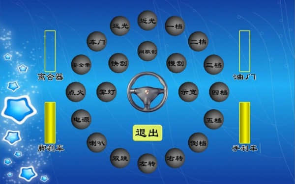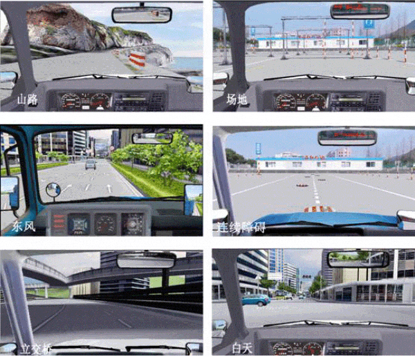 座艙包含了與真實(shí)車輛相同的操作部件,“五大”操縱機(jī)構(gòu):方向盤、離合器,腳剎,油門和手剎。真車變速器:倒檔、一檔、二檔、三檔、四檔、五檔和空擋(自動(dòng)檔只含前進(jìn)檔、倒車檔和駐車檔)。真車操作開關(guān):左轉(zhuǎn)向燈、右轉(zhuǎn)向燈、應(yīng)急燈、喇叭、點(diǎn)火開關(guān)、總電開關(guān)、安全帶、車門、雨刷、遠(yuǎn)光燈、近光燈、遠(yuǎn)近光交替。