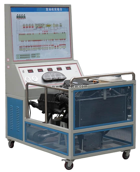 發(fā)動機(jī)總成和發(fā)動機(jī)控制單元、原車線束、儀表總成、冷卻液溫度傳感器、進(jìn)氣溫度傳感器、節(jié)氣門控制總成、空氣質(zhì)量計(jì)、氧傳感器、點(diǎn)火開關(guān)、整套散熱機(jī)構(gòu)、汽油箱和汽油泵總成、蓄電池、五個數(shù)字電壓表、真空壓力表及燃油壓力表、帶有完整彩色電路原理圖面板、外接式檢測端子、智能故障設(shè)置盒總成、可移動臺架、使用說明書及實(shí)驗(yàn)指導(dǎo)書。