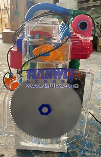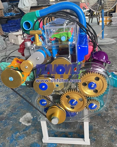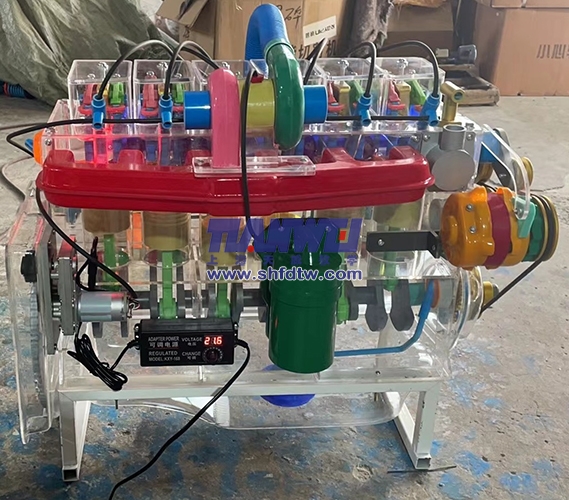 本品選用透明有機(jī)玻璃制作,內(nèi)中部件均以硬質(zhì)塑料料加工。各部分都以壓模成形加工,代替過去膠粘合的方法,使產(chǎn)品在強(qiáng)度上有很大提高。發(fā)動機(jī)總成用電機(jī)驅(qū),能演示發(fā)動機(jī)轉(zhuǎn)速高低。