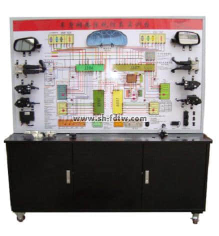 中央控制電腦、左前門控制電腦、右前門控制電腦、左后門控制電腦、右后門控制電腦、車門閉鎖開關(guān)及促動器、門控燈及開關(guān)、儀表、點火鑰匙全套、后視鏡及控制開關(guān)、防盜喇叭、檢測端子、故障設(shè)置系統(tǒng)、大容量蓄電池或12V開關(guān)電源、大型彩色噴繪電路原理圖、控制面板、可移動臺架、使用說明書及任務驅(qū)動式實訓指導書等。