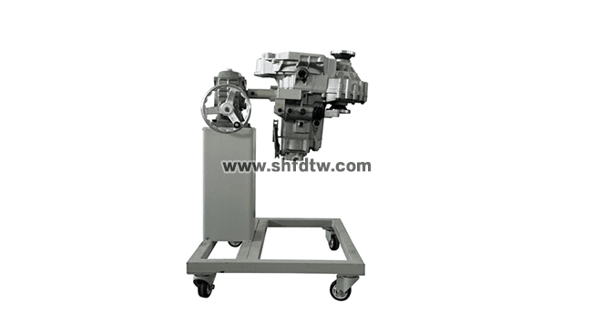 采用減速翻轉(zhuǎn)機(jī)構(gòu),可使變速器旋轉(zhuǎn)任意角度,并能任意位置鎖止,便于學(xué)生從不同的角度進(jìn)行拆卸和裝配。