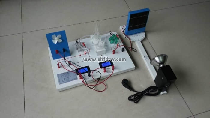 燃料電池教具主要由5部分構(gòu)成:A為太陽能電池模塊,B為電解電池模塊,C為水、氫氣、氧氣儲(chǔ)罐,D為發(fā)電電池模塊,E為風(fēng)扇,F(xiàn)顯示儀表,G測(cè)試導(dǎo)軌。