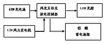 風(fēng)光互補(bǔ)路燈應(yīng)用系統(tǒng)由太陽(yáng)能電池、風(fēng)光互補(bǔ)充放電控制器、蓄電池、蓄電池防水箱、燈桿、太陽(yáng)能電池支架、風(fēng)力發(fā)電機(jī)、法蘭盤(pán)、LED路燈頭等部分組成。