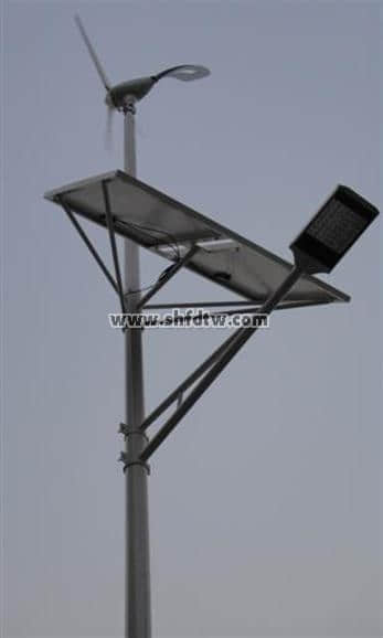⑸把太陽(yáng)能支架、風(fēng)力去架和LED路燈固定在路燈燈桿上;