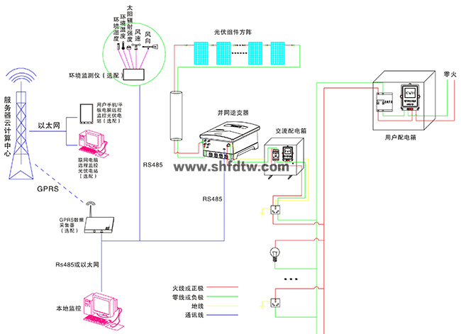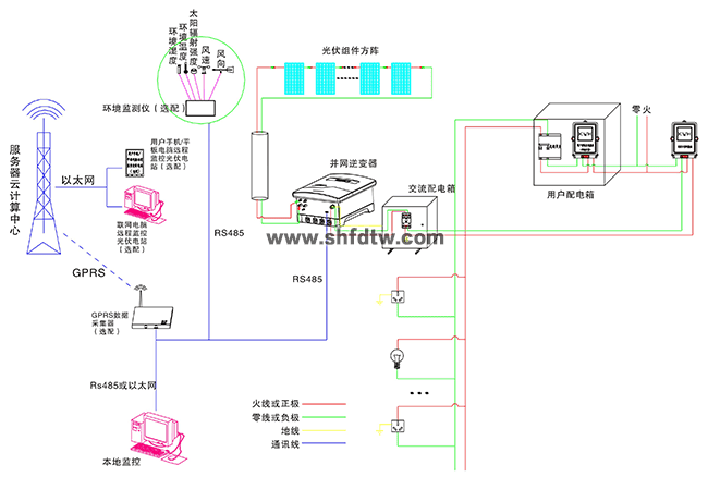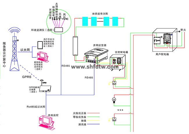 在晴朗的白天,裝在屋頂上的光伏組件發(fā)出的直流電經(jīng)過并網(wǎng)逆變器逆變成與電網(wǎng)同頻率同相位的單相交流電給負(fù)載進(jìn)行供電,在夜晚或陰雨天等太陽光照不足的情況下,系統(tǒng)處于待機(jī)狀態(tài),負(fù)載用電全部來自電網(wǎng)。另外在系統(tǒng)與互聯(lián)網(wǎng)聯(lián)網(wǎng)情況下,可以通過系統(tǒng)監(jiān)控軟件來實(shí)時(shí)查看系統(tǒng)的運(yùn)行狀態(tài)和故障信息,或者是選配遠(yuǎn)程通訊數(shù)據(jù)采集器,將系統(tǒng)工作數(shù)據(jù)通過GPRS或以太網(wǎng),傳輸?shù)侥氖謾C(jī)、平板電腦或任意一臺(tái)聯(lián)網(wǎng)的電腦,以便于遠(yuǎn)程實(shí)時(shí)掌控電站的信息。