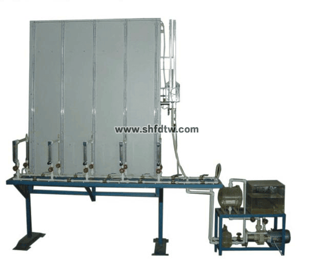 下半部由管道、閥門、流量計、穩(wěn)壓罐、鍋爐、水泵組成,用來模擬由5個用戶組成的熱水網(wǎng)路。上半部有高位水箱和安裝在一塊垂直木版上的12根玻璃管,玻璃管的頂端與大氣相通,玻璃管下端用膠管與網(wǎng)路分支點相接,用來測量熱網(wǎng)用戶連接點處的供水干管與回水干管的測壓管水頭(水壓曲線高度)。每組用戶的兩支玻璃管間附有標尺以便直觀的讀出各點壓力。